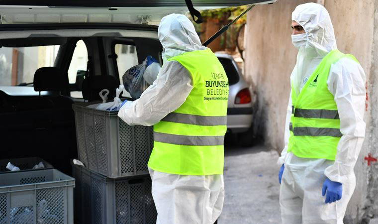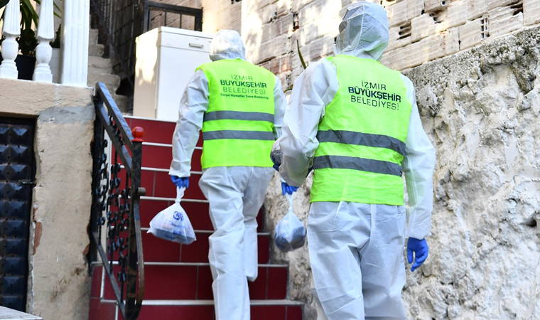 Hastalar İzmir İl Sağlık Müdürlüğü işbirliğinde tespit ediliyor. Tespit edilen hastalar arasında talepte bulunanlara İzmir Büyükşehir Belediyesi’nin iştiraki Grand Plaza’ya ait ekipler yemek dağıtıyor. Büyükşehir ekipleri, koruyucu kıyafetleriyle sosyal mesafe ve hijyen koşullarına dikkat ederek yemekleri kapıya bırakıyor.