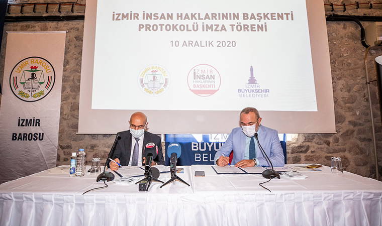İnsan hakları alanında yürüttüğü çalışmaların kapsamını genişletmeyi ve İzmir’i bu alandaki uluslararası etkinliklerin merkezi haline getirmeyi hedefleyen İzmir Büyükşehir Belediyesi, İzmir Barosu ile birlikte yürüteceği “İzmir İnsan Haklarının Başkenti Projesi” kapsamında protokol imzaladı. 10 Aralık Dünya İnsan Hakları Günü'nde Alsancak'taki Tarihi Havagazı Fabrikası'nda düzenlenen törene CHP Genel Başkan Yardımcısı Gülizar Biçer Karaca, İzmir Büyükşehir Belediye Başkanı Tunç Soyer, İzmir Barosu Başkanı Özkan Yücel, CHP İzmir İl Başkanı Deniz Yücel, Konak Belediye Başkanı Abdül Batur, Karşıyaka Belediye Başkanı Cemil Tugay, İzmir Büyükşehir Belediyesi Genel Sekreteri Dr. Buğra Gökçe, belediye meclis &uu ml;yeleri ve bürokratlarıyla avukatlar katıldı.