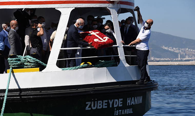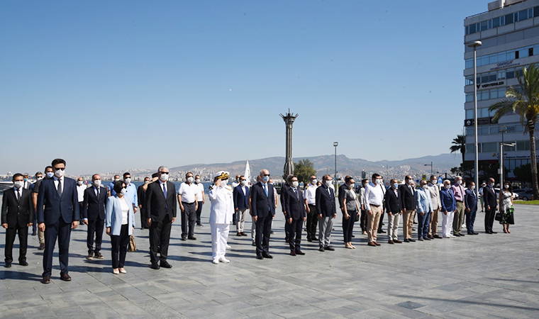 Cumhuriyet Meydanı’nda başlayan törende, Atatürk Anıtı’na çelenk bırakıldı ve bir dakikalık saygı duruşunda bulunuldu. Ardından İzmir Körfezi’ne deniz şehitlerinin anısına Pasaport İskelesi’ndeki Zübeyde Hanım Müze Ve Eğitim Gemisi’nden çelenk atıldı. Törene İZDENİZ’e ait yolcu vapurları ile Kıyı Emniyeti ve deniz polisi tekneleri de siren çalarak eşlik etti.