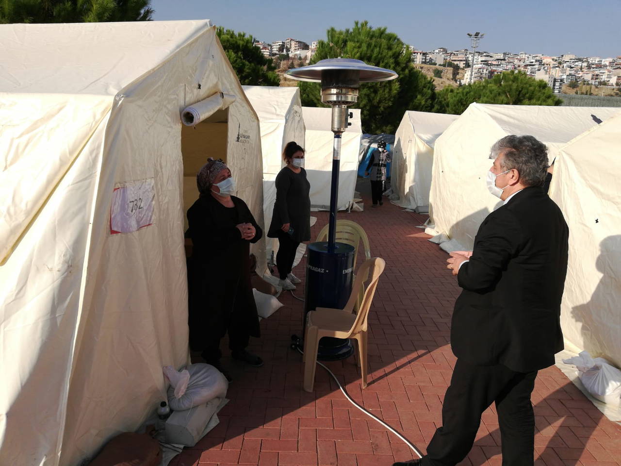Yardımların depolandığı yerlerden biri olan Bornova’daki Âşık Veysel Rekreasyon Alanı’nda çocuk bezinden dayanıklı tüketim eşyasına kadar her şey bulunuyordu. Görevliler, “Hemen tüketilmesi gerekenleri 13 çadır bölgesine ulaştırıyoruz. Ötekileri gereksinime göre paylaştırıyoruz” diyor.