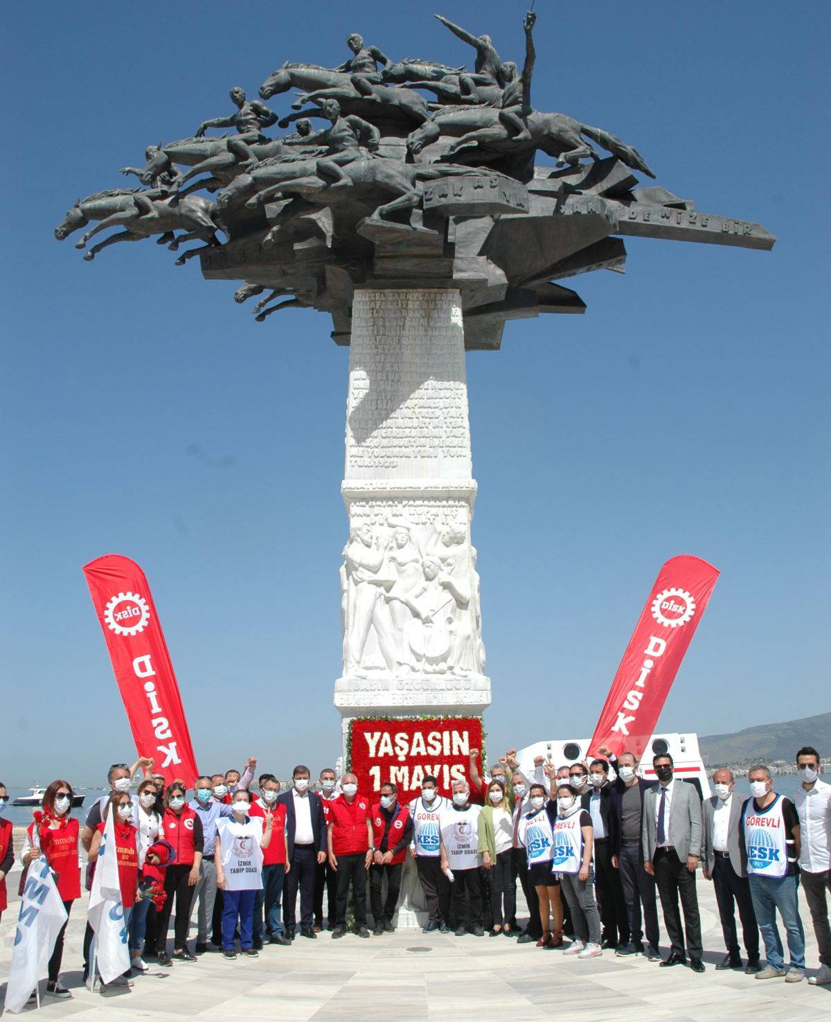 İzmir'de DİSK, KESK, İzmir Tabip Odası, İzmir Barosu, TTB ve TMMOB tarafından "Yaşasın 1 Mayıs" yazılı dev bir çelenk Gündoğdu Meydanı'na bırakıldı. Kutlamada halay çekip, sloganlar atan grup hükümeti eleştirdi.