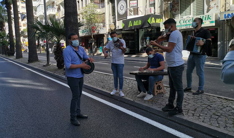 İzmir'de eğlence sektöründe iş yapamaz duruma gelen müzisyenler geçimlerini sağlamak için sokaklarda çalıp söylüyor. İzmir'in Konak ilçesine bağlı Alsancak semtinde sokakları gezerek mesleklerini icra eden müzisyenlere bayramı evlerinde geçiren yurttaşlar destek oluyor. Gönüllerinden kopan parayı aşağıya atan yurttaşların desteğiyle geçimlerini sağladıklarını belirten müzisyenler yaşadıkları sıkıntıları ANKA Haber Ajansı’na anlattı.
