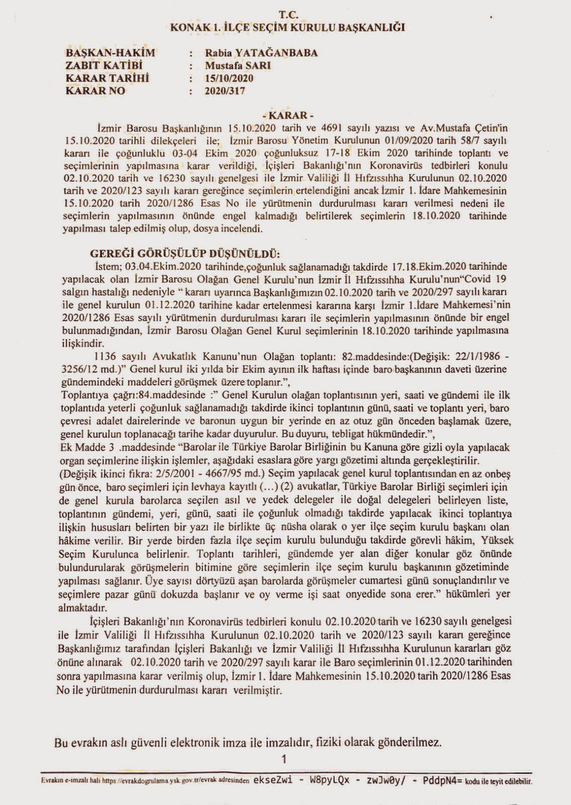 Kararda şu ifadelere yer verildi: 1. İzmir Barosu Olağpan Genel Kurulu’nun 18.10.2020 tarihinde yapılması yönündeki taleplerin reddine2. 1136 sayısı Avukatlık Kanununun 84. ve ek 3. maddesinde aranan koşullar yeniden sağlanarak başkanlığımıza müracaat edildiği takdirde İzmir Barosu Olağan Genel Kurulu’nun yapılıp yapılmayacağının ayrıca değerlendirileceği"Sosyal medyadan seçim kurulunun ret kararını paylaşan Mustafa Çetin, ''İzmir 1. İdare Mahkemesince baroların genel kurullarının ertelenmesine ilişkin karara dayanak işlemden yönünden yürütmeyi durdurma kararı verilmiş olmasına rağmen, ilçe seçim kuruluna bu haftasonu genel kurulumuzun yapılmasına yönelik başvurumuz reddedilmiştir''