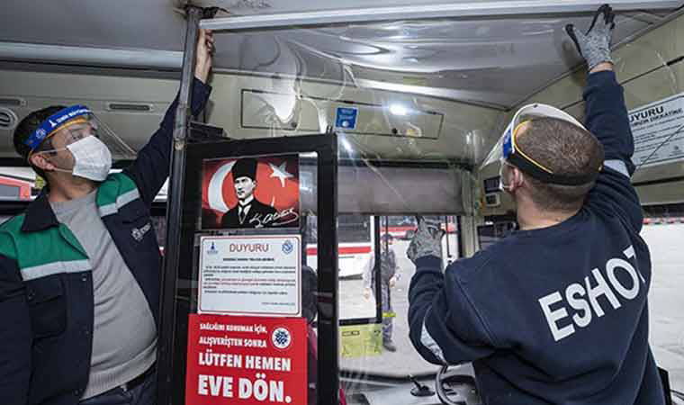 İzmir Büyükşehir Belediyesi korona virüs salgınına karşı personelini de koruyor. ESHOT ve İZULAŞ genel müdürlükleri risk altındaki meslek gruplarından otobüs şoförleri için iki ilave önlem aldı. Yarım kabinli ve kabinsiz otobüslere, ESHOT ve İZULAŞ atölyelerinde kalın naylon malzemeden şoför kabini yapıldı. Ayrıca işyeri hekimlerinin de görüşleri doğrultusunda ESHOT Genel Müdürlüğünce tüm şoförler için koruyucu başlık üretildi ve bu başlıklar şoförlere dağıtıldı.