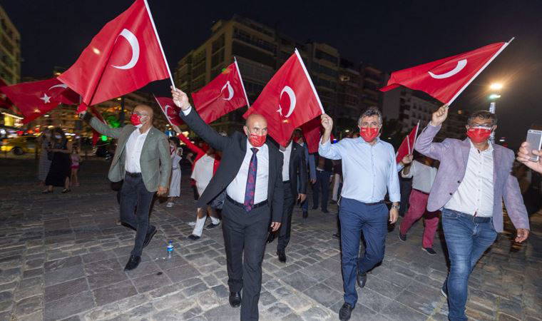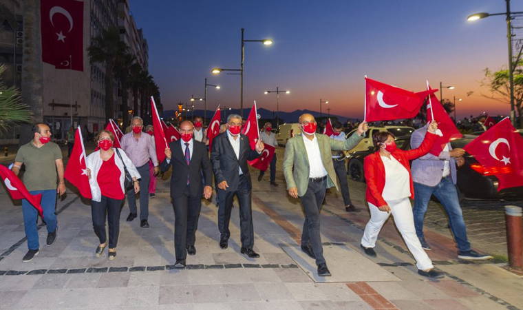 Kortej yürüyüşüne İzmir Büyükşehir Belediye Başkanı Tunç Soyer, İzmir Büyükşehir Belediyesi Başkan Vekili Mustafa Özuslu, CHP İzmir İl Başkanı Deniz Yücel, CHP İzmir milletvekilleri Mahir Polat ile Tacettin Bayır, Menderes Belediye Başkanı Mustafa Kayalar, Bayraklı Belediye Başkanı Serdar Sandal, Karaburun Belediye Başkanı İlkay Girgin Erdoğan ve bazı partililer katıldı. Grup, ellerindeki Türk bayraklarıyla Cumhuriyet Meydanı'ndan Gündoğdu Meydanı'na yürüdü. Başkan Soyer, yürüyüş güzergahı boyunca kendilerine destek veren halkı selamlayarak yürüyüşü tamamladı.