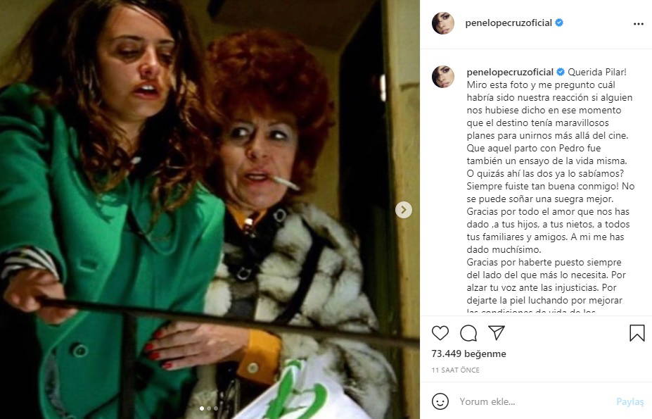 "Sevgili Pilar, bu fotoğrafa bakıyorum ve biri şu anda beyaz perdenin ötesinde kaderin bizim için hazırladığı harika planları söyleseydi tepkimiz ne olurdu diye merak ediyorum. Bana karşı her zaman iyiydin. Daha iyi bir kayınvalideye sahip olmayı hayal edemezdim. Bize, çocuklarına, torunlarına, ailene ve arkadaşlarına verdiğin tüm sevgi için teşekkür ederim. Bana çok şey kattın. Her zaman en çok ihtiyacı olanın yanıda olduğun ve adaletsizliğe karşı sesini yükselttiğin için teşekkür ederim."