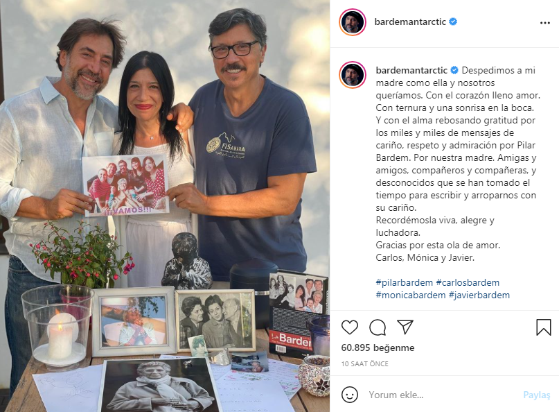 Açıklamada, Pilar'ın çocukları Javier, Monica ve Carlos'un annelerine ettiği teşekküre yer verilerek "Örnek annemiz Pilar Bardem'in vefat haberini paylaşıyoruz. Ailesinin sevgisi ile çevrili olarak huzur içinde ve acı çekmeden bu dünyadan göç etti" denildi.