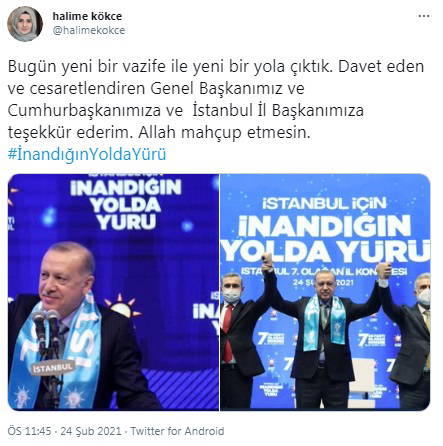 Kökçe, göreve getirilişini "Bugün yeni bir vazife ile yeni bir yola çıktık. Davet eden ve cesaretlendiren Genel Başkanımız ve Cumhurbaşkanımıza ve İstanbul İl Başkanımıza teşekkür ederim. Allah mahçup etmesin. Bu akşam epey dua biriktirdim. Arayan, mesaj atan, dua eden herkese çok teşekkür ederim. Bismillah" ifadeleriyle duyurdu.