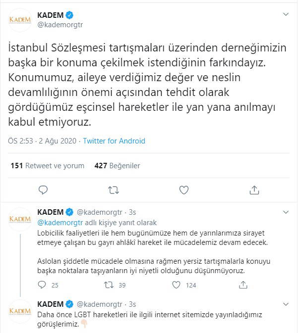 KADEM'in sosyal medya hesabından tartışmalara ilişkin yapılan açıklamada, "İstanbul Sözleşmesi tartışmaları üzerinden derneğimizin başka bir konuma çekilmek istendiğinin farkındayız. Konumumuz, aileye verdiğimiz değer ve neslin devamlılığının önemi açısından tehdit olarak gördüğümüz eşcinsel hareketler ile yan yana anılmayı kabul etmiyoruz" ifadeleri kullanıldı.