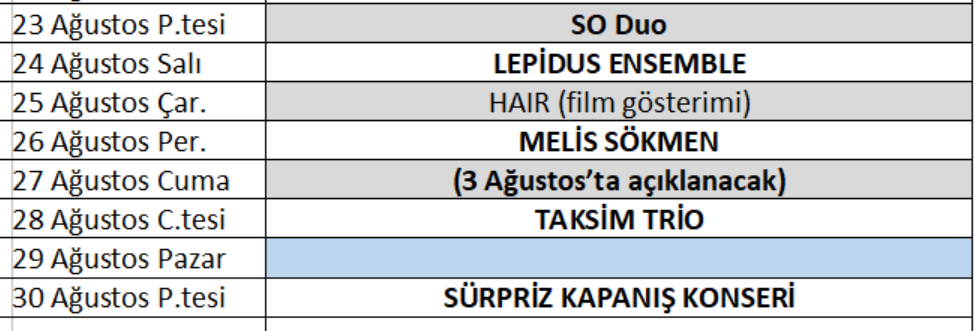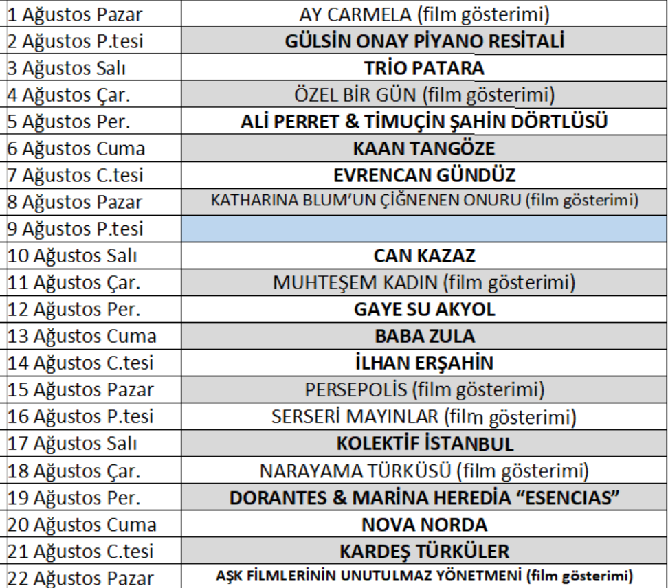 İki ay boyunca yaklaşık 51 etkinliğe ev sahipliği yapacak olan Kalamış Yaz Festivali 30 Ağustos akşamı önümüzdeki günlerde açıklanacak sürpriz bir ismin konseriyle son bulacak.