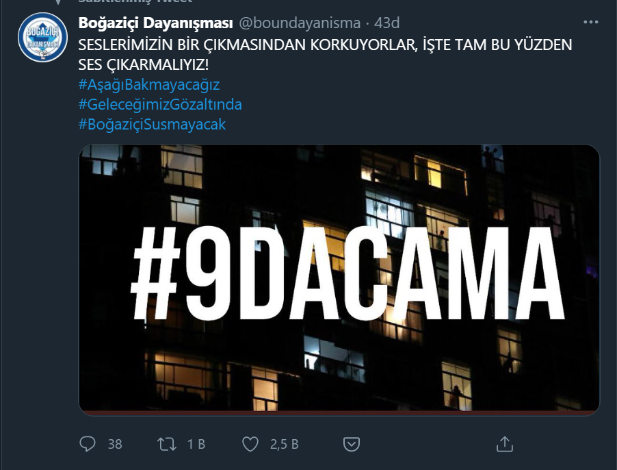 Boğaziçi Dayanışması, saat 21:00'de "Kayyumlara karşı öğrencilerin yanında olduğumuzu duyurmak için her yerde ses çıkartıyoruz!" diyerek eylem çağrısı yaptı.