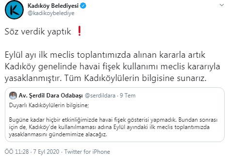 Sakarya'da meydana gelen havai fişek faciasının ardından CHP'li Kadıköy Belediye Başkanı Şerdil Dara Odabaşı, havai fişek kullanımının yasaklanmasını Eylül ayındaki ilk belediye meclis toplantısında gündeme alınacağını duyurmuştu.