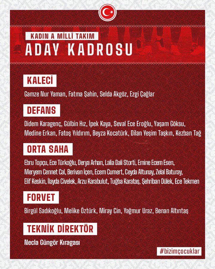 Kadın A Milli Takımı’nın 14 Haziran 2021 tarihinde İstanbul’da Bulgaristan ile oynayacağı hazırlık müsabakasının aday kadrosu açıklandı. İşte kadro: