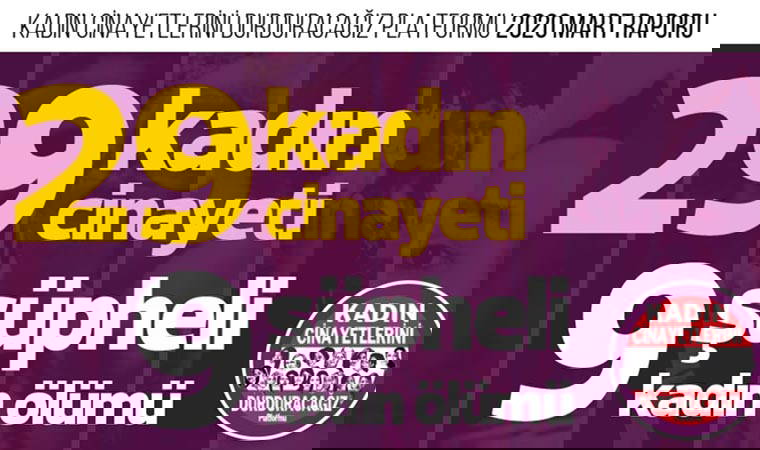 Kadın Cinayetlerini Durduracağız Platformu Mart ayı raporunu açıkladı. Rapora göre Mart ayında erkekler tarafından 29 kadın öldürüldü. Raporda, “Bu ay 29 kadın cinayeti işlenmiş, 9 kadın şüpheli bir şekilde ölü bulunmuştur. Evden çıkmama çağrılarının yapıldığı 11 Mart’tan, 31 Mart’a geçen 20 günlük süreçte ise 21 kadın öldürüldü. 23 kadının neden öldürüldüğü tespit edilemedi, 2’si ekonomik bahaneyle, 4’ü sosyal medya hesabı açmak, boşanmak istemek ya da barışma isteğini reddetmek gibi kendi hayatına dair karar almak isterken öldürüldü. 23 kadının hangi bahaneyle öldürüldüğünün tespit edilememesi, koronavirüs günlerinde kadına yönelik şiddetin ve kadın cinayetlerinin görünmez kılınmasının sonucu” denildi.