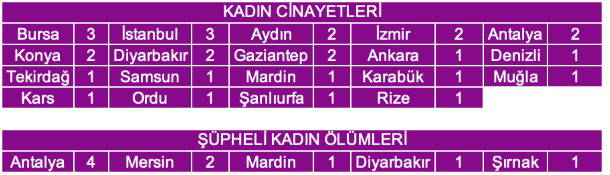 Raporda, illere göre Mart ayının kadın cinayetleri verileri ise şöyle sıralandı: