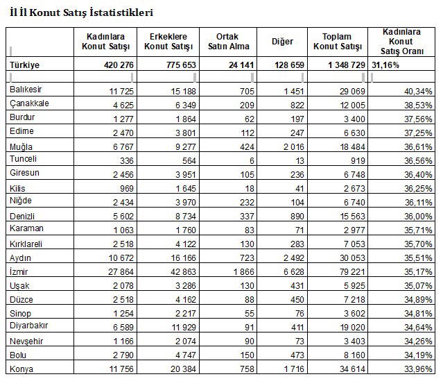 - TÜİK, sitesinde 2014 yılından bu yana cinsiyete göre istatistiklere yer veriyor. 2014 yılında yüzde 29,5 olan kadınlara konut satış oranı, 2015 yılında yüzde 29,6’ya çıktıktan sonra 2016 yılında yüzde 29,2’ye; 2017 yılında ise yüzde 29,1’e gerilemişti. Söz konusu oran 2018 yılında yüzde 30,6’ya ulaşırken, 2019 yılında yakalanan yüzde 31,16’lık oran ile söz konusu verilerin yayınlandığı dönemde en yüksek seviyeye ulaşıldı.