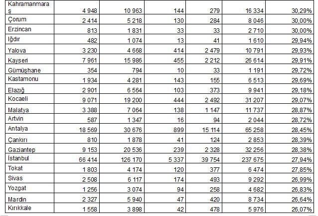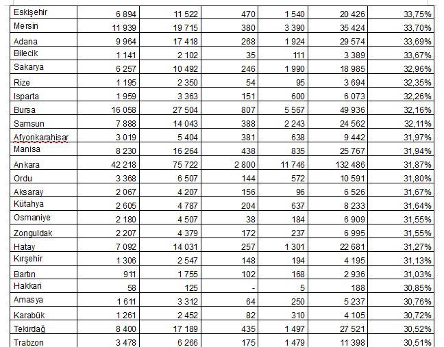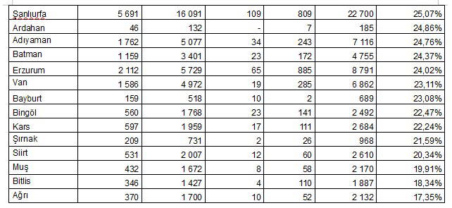 DOĞU İLLERİ LİSTENİN SON SIRALARINDA