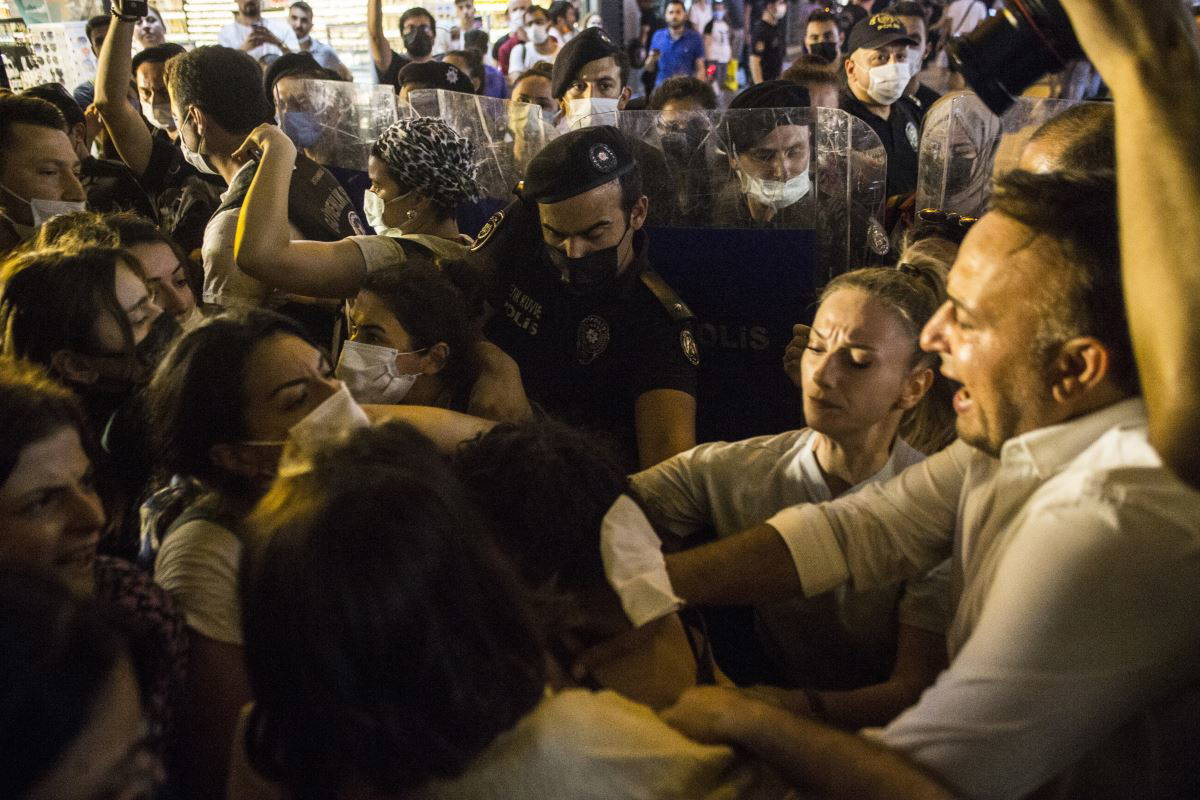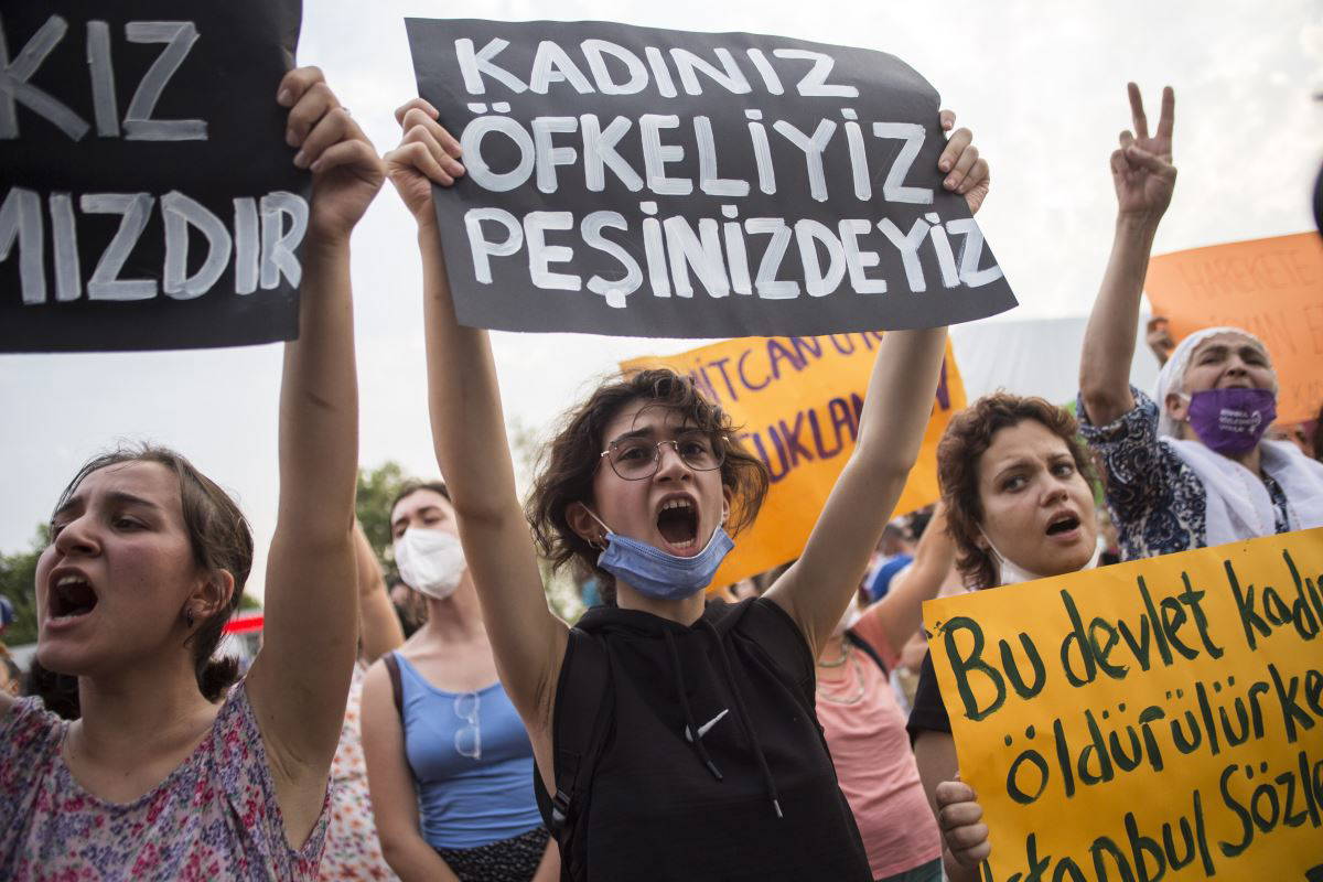 “Katledilen kadınlar isyanımızdır” sloganıyla bir araya gelen yüzlerce kadın eylemde, "Kadınlar katledilirken bu devlet İstanbul Sözleşmesi'nden çıktı. Hayatlarımız için isyandayız" pankartı açtı.