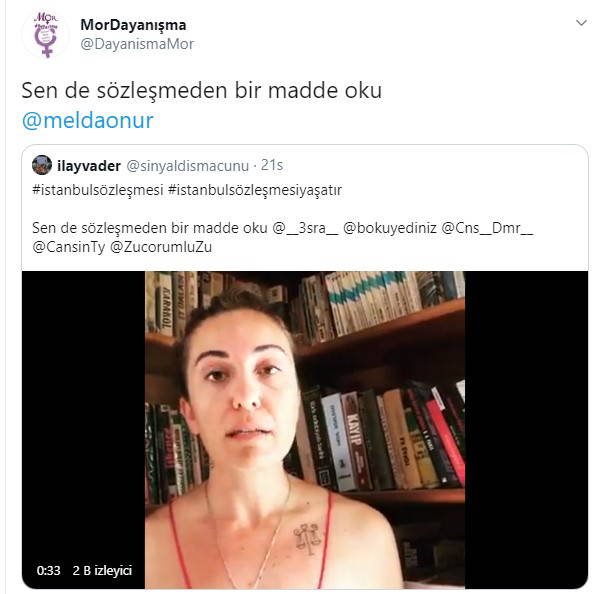 Sözleşmenin bir maddesini okudukları videoyu paylaşan kadınlar, #İstanbulSözleşmesiYaşatır etiketiyle diğer kadınları da zincire katılmaya davet ediyor.