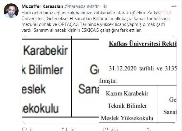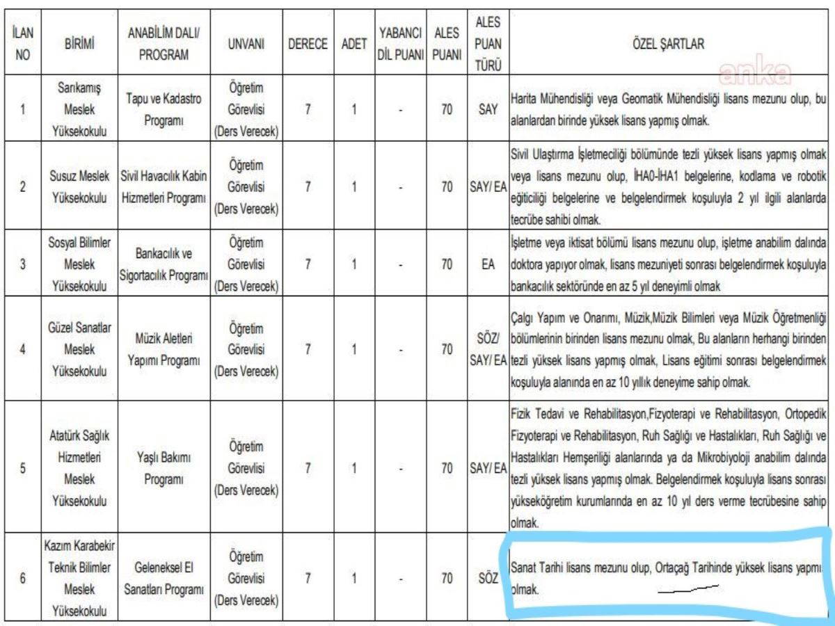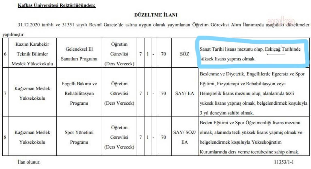 Kafkas Üniversitesi Rektörlüğü, 31 Aralık 2020 tarihinde 28 öğretim görevlisi alımı için Resmi Gazete’de ilan yayımladı. İlanda Kazım Karabekir Teknik Bilimler Meslek Yüksek Okulu’nda Geleneksel El Sanatları Programı için öğretim görevlisi alınacağı duyurulurken, sanat tarihi mezun olmak ve Orta Çağ tarihinde yüksek lisans yapmış olmam özel şartlar arasında sıralandı. Üniversite ilandan iki gün sonra Resmi Gazete’de bir ilan daha yayımlayarak, Geleneksel El Sanatları Programı için aradığı ortaçağ tarihinde yüksek lisans mezunu olma şartını Eski Çağ tarihi olarak değiştirdi.