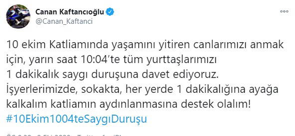 "10 ekim Katliamında yaşamını yitiren canlarımızı anmak için, yarın saat 10:04’te tüm yurttaşlarımızı 1 dakikalık saygı duruşuna davet ediyoruz. İşyerlerimizde, sokakta, her yerde 1 dakikalığına ayağa kalkalım katliamın aydınlanmasına destek olalım!