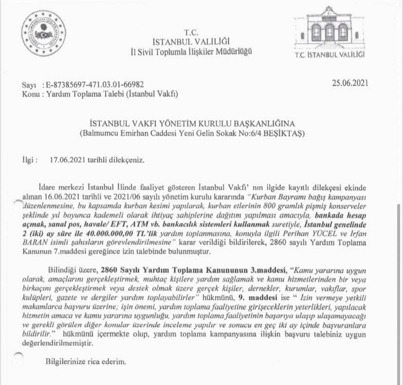 İçişleri Bakanlığı Sivil Toplumla İlişkiler Genel Müdürlüğü'nün resmi Twitter hesabında yapılan açıklamada "Merkezi İstanbul ilinde faaliyet gösteren İstanbul Vakfı'nın Kurban Bayramı Yardım Toplama Kampanyası kapsamındaki izin talebi, İstanbul Valiliği'nde tarafımıza iletilmiş olup, yapılan değerlendirmeler neticesinde uygunluk derecesinde söz konusu vakfın talebine izin verilmiştir" dendi.
