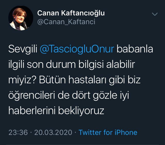 Kaftancıoğlu, Onur Taşçıoğlu’na sosyal medyadan mesaj göndererek, “Babanla ilgili son durum bilgisi alabilir miyiz? Bütün hastaları gibi biz öğrencileri de dört gözle iyi haberlerini bekliyoruz” dedi.