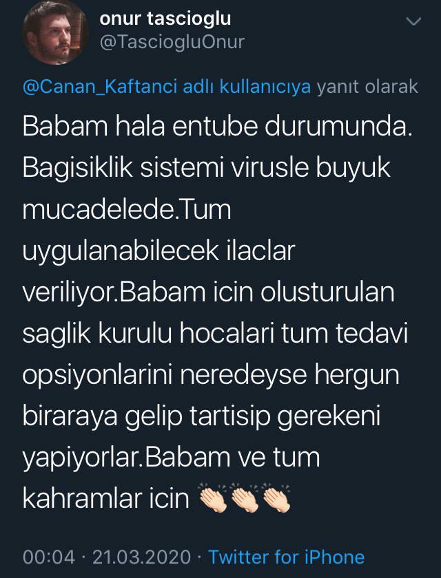 Onur Taşçıoğlu ise, Kaftancıoğlu’na, “Babam hala entube durumunda. Bağışıklık sistemi virüsle büyük mücadelede. Tüm uygulanabilecek ilaçlar veriliyor. Babam için oluşturulan sağlık kurulu hocaları, tüm tedavi opsiyonlarını neredeyse her gün bir araya gelip, tartışıp gerekeni yapıyorlar. Babam ve tüm kahramanlar için…” yanıtını verdi ve ‘alkış’ ifadesini paylaştı.