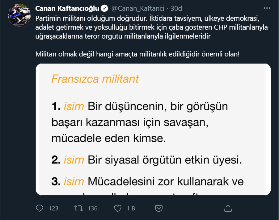 Kaftancıoğlu, sosyal medya hesabından yaptığı paylaşımda, sözlükten "militan" kelimesinin anlamını paylaştı ve şu ifadeleri kullandı: