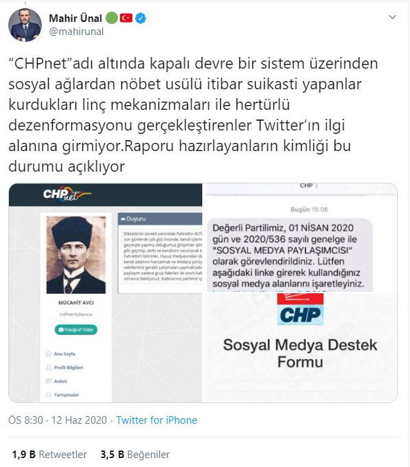 Ünal, “CHPnet”adı altında kapalı devre bir sistem üzerinden sosyal ağlardan nöbet usülü itibar suikasti yapanlar kurdukları linç mekanizmaları ile hertürlü dezenformasyonu gerçekleştirenler Twitter’ın ilgi alanına girmiyor.Raporu hazırlayanların kimliği bu durumu açıklıyor" ifadelelerini kullandı.