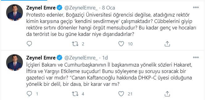 Protesto edenler, Boğaziçi Üniversitesi öğrencisi değilse, atadığınız rektör kimin karşısına geçip ‘kendini sevdirmeye’ çalışmaktadır? Cübbelerini giyip rektöre sırtını dönenler hangi örgüt mensubudur? Bu kadar genç ve hocaları da terörist ise bu güne kadar niye dışarıdadırlar?”