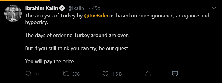 Cumhurbaşkanlığı Sözcüsü İbrahim Kalın sosyal medya hesabından ABD Başkan adayı Joe Biden'ın açıklamalarına tepki gösterdi. Kalın İngilizce yaptığı paylaşımda, “Biden'ın Türkiye analizi saf bir cehalete dayanıyor. Türkiye'ye emir verilen günler geride kaldı” ifadelerini kullandı.