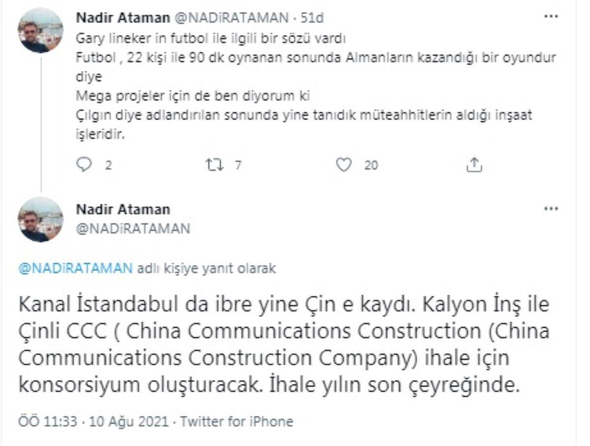İBB ve Bakırköy'ün CHP'li Belediye Meclis Üyesi Nadir Ataman, ihalede ibrenin AKP'ye yakınlığıyla bilinen Kalyon'un ve Çinli CCCC şirketinin oluşturduğu konsorsiyuma kaydığını söyledi.