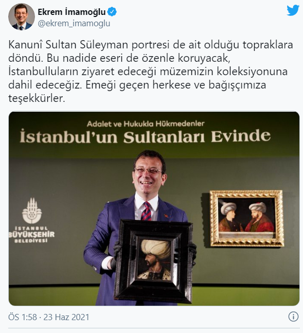 İmamoğlu, tablonun İstanbul'a gelmesinde emeği geçen bağışçıya teşekkür ederek "Kanunî Sultan Süleyman portresi de ait olduğu topraklara döndü. Bu nadide eseri de özenle koruyacak, İstanbulluların ziyaret edeceği müzemizin koleksiyonuna dahil edeceğiz. Emeği geçen herkese ve bağışçımıza teşekkürler" açıklaması yaptı.