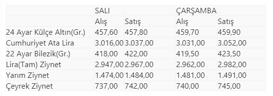 İstanbul Kapalıçarşı'da alınıp satılan altın türlerinin, önceki kapanış ve bugün açılış fiyatları (TL) şöyle:
