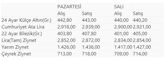 İstanbul Kapalıçarşı'da alınıp satılan altın türlerinin, önceki kapanış ve bugün açılış fiyatları (TL) şöyle: