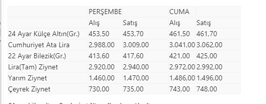 İstanbul Kapalıçarşı'da alınıp satılan altın türlerinin, önceki ve bugün itibarıyla kapanış fiyatları (TL) şöyle: