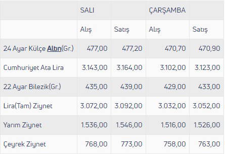 İstanbul Kapalıçarşı'da alınıp satılan altın türlerinin, önceki ve bugün itibarıyla kapanış fiyatları (TL) şöyle: