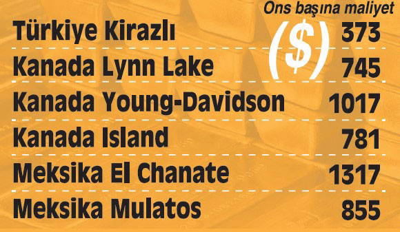 Çanakkale’nin merkeze bağlı Kirazlı köyü yakınlarında altın ve gümüş madeni projesi tepkilere rağmen devam ederken proje, yüzde 44’lük getiri oranıyla Kanada merkezli Alamos Gold’un en yüksek kâr oranına sahip projesi olacak. Şirketin internet sitesinde yer alan verilere göre, Kirazlı’da bir ons altın ortalama 375 dolar maliyetle üretilecek. Bu rakam, Alamos Gold’un Kanada’daki Young-Davidson Madeni’nde 1017 ve Island Madeni’nde ise 781 dolar seviyesinde. Ons başına maliyet, şirketin Meksika’daki El Chanate Madeni’nde 1317 doları bulurken, yine Meksika’daki Mulatos Madeni’nde 855 dolar seviyesinde.
