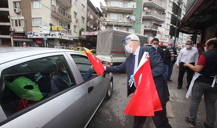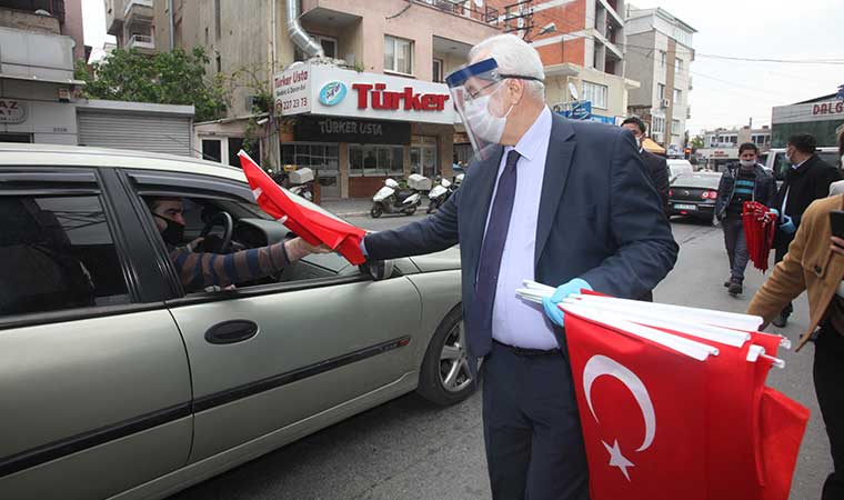 Koronavirüs salgını nedeniyle uygulanacak 4 günlük sokağa çıkma yasağı, Karabağlar'da 23 Nisan'ın 100. yıl gurur ve coşkusuna engel olmadı. Karabağlar Belediye Başkanı Muhittin Selvitopu, 7'den 70'e tüm vatandaşları evlerinden de olsa bu coşkuya ortak olmaya çağırdı. Bu kapsamda ilçenin farklı mahallelerinde kurulan pazarlarda vatandaşlara ve esnafa Türk Bayrağı dağıtan Başkan Selvitopu, bugün de Yunus Emre Pazaryeri'ni ziyaret etti. Salgına karşı alınan önlemleri yerinde denetleyen Başkan Selvitopu, daha sonra Eskiizmir Caddesi'nde vatandaşlarla buluştu. Bayrak dağıtımına burada devam eden Başkan Selvitopu, Karabağlar'ın dört bir yanını Türk bayraklarıyla donatarak ulusal egemenliğin 100. yılını görkemli bir şekilde kutlama çağrısı yaptı.
