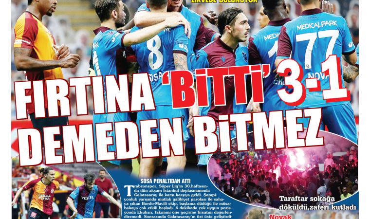 Yerel gazeteler, Süper Lig’in 30’uncu haftasında Trabzonspor’un deplasmanda Galatasaray’ı 3-1 mağlup ettiği maçın ardından, ‘biz bitti demeden bitmez’ yorumlarını yaptı. Karadeniz gazetesi, “Adımız Trabzon namımız Fırtına, biz bitti demeden bitmez”, Taka gazetesi, “Fırtına bitti demeden bitmez”, Kuzey Ekspres gazetesi, “Bu fırtına bitmez!”, “Deplasmanda Galatasaray’ı net skorla 3-1 mağlup eden bordo-mavililer, Başakşehir’in arkasına dayandı!”, Günebakış gazetesi, “Biz bitti demeden bitmez”, “Şampiyonlukta sonuna kadar VAR’ız”, Karadeniz’de Sonnokta gazetesi, “Şampiyonluk yürüyüşü”, “Galatasaray’ı İstanbul’da deviren Trabzonspor, mutlu sona kararlı adımlarla ilerliyor” başlıklarını kullandı.