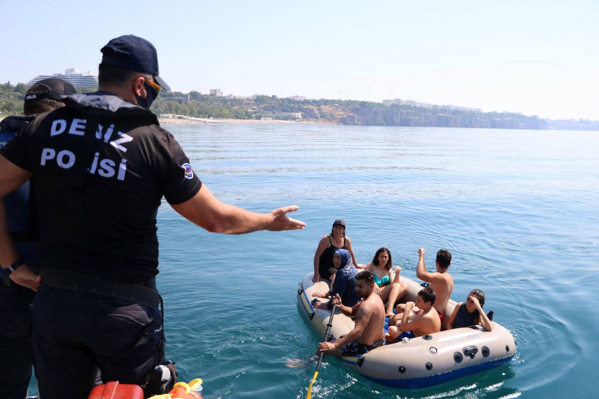 Vatandaşın uyarıya el sallayarak teşekkür ettiği dikkati çekerken, polis ekipleri de kurallara uyanlara el sallayıp, siren çalarak, teşekkür etti. Konyaaltı Sahili açıklarında lastik bot gören deniz polisi, yanına giderek, bottakilere uyarıda bulundu. Lastik botla açılmanın tehlikeli olacağını anlatan deniz polisi, bottaki 7 kişinin sosyal mesafe ve maske kurallarına da uymadığını tespit etti. Bir kere için uyarıda bulunulan aile, lastik botla birlikte 'karakolbot'a alınarak, kıyıya götürüldü.