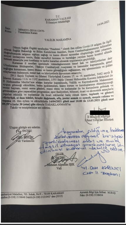 2911 sayılı Toplantı ve Gösteri Yürüyüşleri Kanunu 17. ve 19. maddeleri, 5442 sayılı İl Hıfzıssıhha Meclisi'nce alınan kararlar kapsamında, Valilik ve Kaymakamlık Makamının uygun göreceği etkinlikler, basın açıklamaları, kamu kurum ve kuruluşlarının düzenleyeceği resmi bayram, resmi anma günleri, resmi tören ve kutlamalar ile bu kurumların gelenek ve göreneklere göre yapacakları programlar, spor faaliyetleri, bilimsel, ticari ve ekonomik amaçlarla yapılan etkinlik ve toplantılar ile ticari reklamlar hariç olmak üzere, toplantı ve gösteri yürüyüşü, el ilanı bildiri, broşür dağıtmak, afiş, poster asmak ve açmak, meşale yakma ve taşıma vb. tüm eylem ve etkinliklerin 14/04/2021 günü saat 10.00 ile 13.05.2021 günü saat 09.59'a kadar 30 (otuz) gün süreyle YASAKLANMASI'nı Takdir ve tensiplerinize arz ederim."