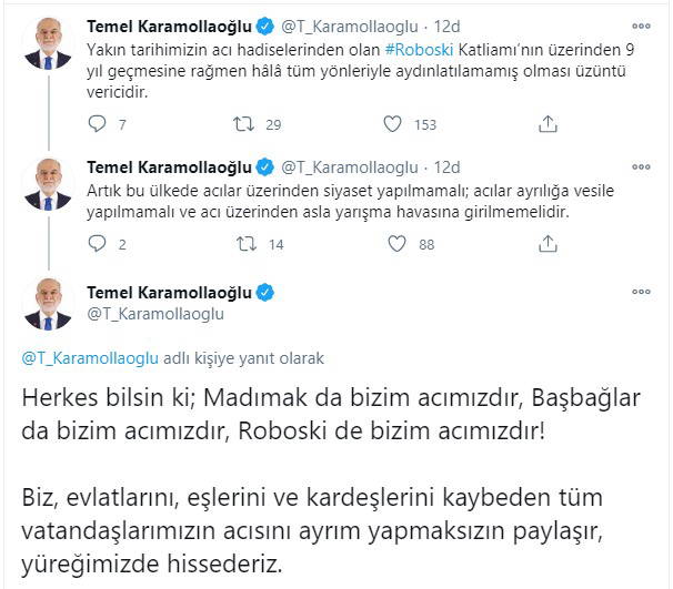 "Yakın tarihimizin acı hadiselerinden olan #Roboski Katliamı’nın üzerinden 9 yıl geçmesine rağmen hâlâ tüm yönleriyle aydınlatılamamış olması üzüntü vericidir. Artık bu ülkede acılar üzerinden siyaset yapılmamalı; acılar ayrılığa vesile yapılmamalı ve acı üzerinden asla yarışma havasına girilmemelidir. Herkes bilsin ki; Madımak da bizim acımızdır, Başbağlar da bizim acımızdır, Roboski de bizim acımızdır! Biz, evlatlarını, eşlerini ve kardeşlerini kaybeden tüm vatandaşlarımızın acısını ayrım yapmaksızın paylaşır, yüreğimizde hissederiz."