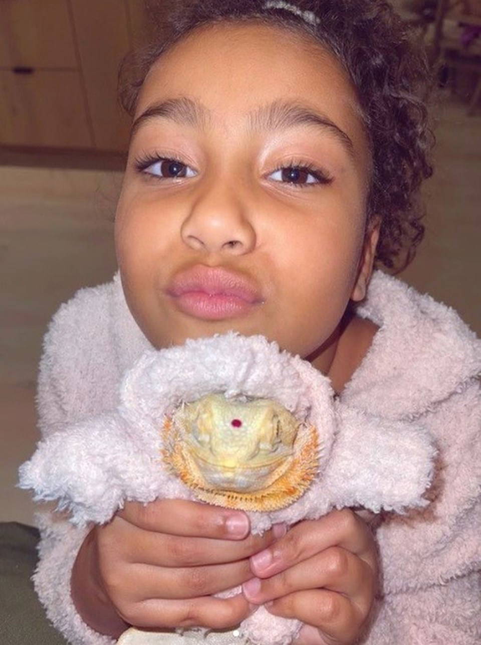 Kardashian "Speed, özel yapım Skims Cozy ve hatta Lil Uzi mücevheriyle görünümünü baştan yarattı. North ve sakallı ejderhası her yere beraber gidiyorlar, çok sevimli" diye ekledi.