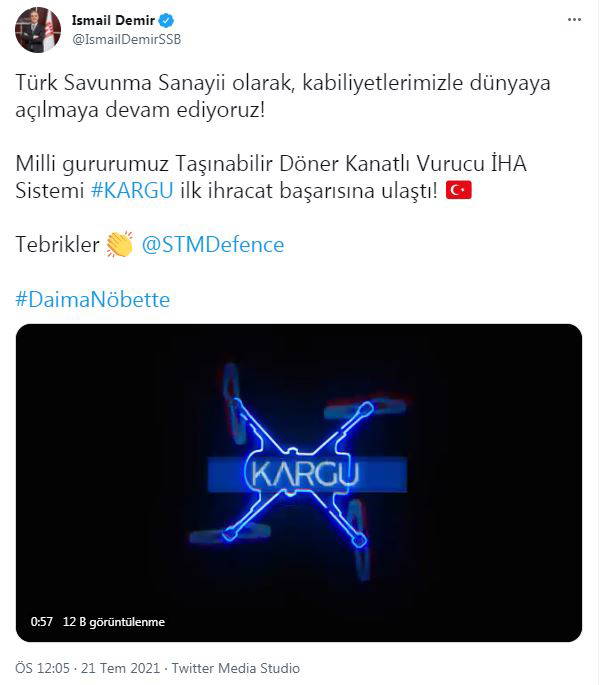 Demir, Twitter hesabından yaptığı paylaşımda ise "Türk savunma sanayi olarak, kabiliyetlerimizle dünyaya açılmaya devam ediyoruz. Milli gururumuz Taşınabilir Döner Kanatlı Vurucu İHA Sistemi Kargu, ilk ihracat başarısına ulaştı. Tebrikler" ifadesini kullandı.