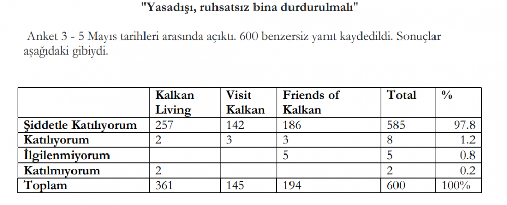 Bölgede yaşayan yabancıların sosyal medya ve bölgeyle ilgili internet siteleri üzerinden yapılan ankette, katılımcılara “Yasadışı, ruhsatsız bina durdurulmalı” önermesi hakkında ne düşündükleri soruldu. Bölgede yaşayan 600 yabancının katıldığı ankette 593 kişi kaçak inşaatların durdurulması yönünde oy kullandı. Ankette kullanılan “Yasadışı, ruhsatsız bina durdurulmalı” yönündeki önermeye, yalnızca 2 kişi “katılmıyorum” şeklinde görüş bildirirken, 5 katılımcı ise “ilgilenmiyorum” görüşünü bildirdi.