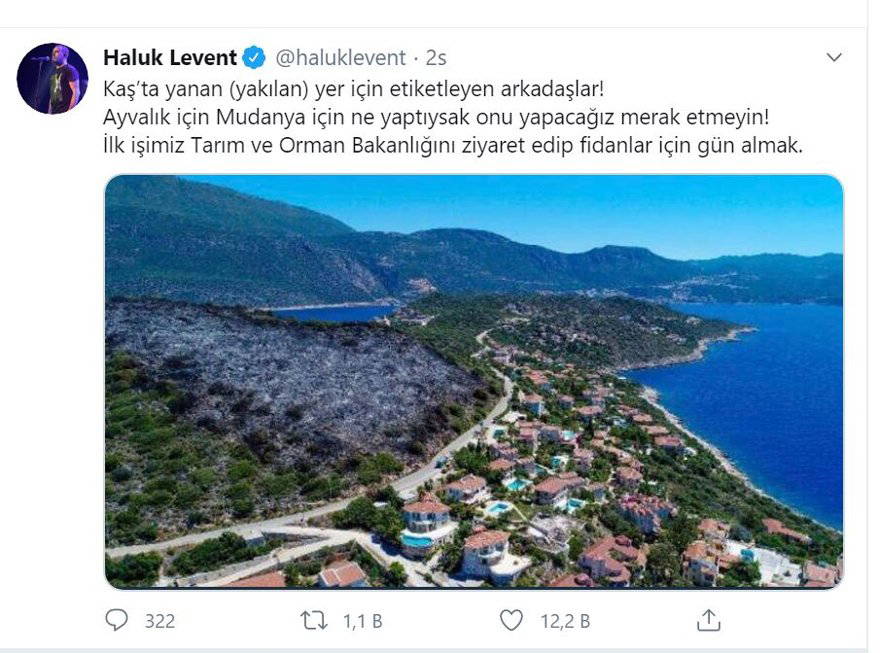 Sanatçı Haluk Levent twitter hesabında yaptığı paylaşımda, “Kaş'ta yanan (yakılan) yer için etiketleyen arkadaşlar! Ayvalık için Mudanya için ne yaptıysak onu yapacağız merak etmeyin! İlk işimiz Tarım ve Orman Bakanlığını ziyaret edip fidanlar için gün almak” dedi.