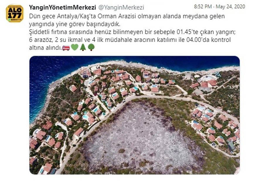 Yangın Yönetim Merkezi’nin açıklamasında, “Dün gece Antalya/Kaş’ta Orman Arazisi olmayan alanda meydana gelen yangında yine görev başındaydık. Şiddetli fırtına sırasında henüz bilinmeyen bir sebeple 01.45’te çıkan yangın; 6 arazöz, 2 su ikmal ve 4 ilk müdahale aracının katılımı ile 04.00’da kontrol altına alındı” denildi.