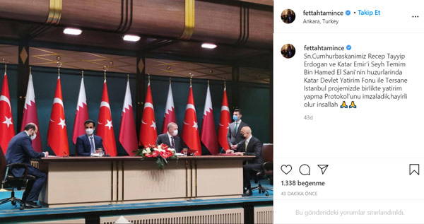 Öte yandan, Tamince, kişisel Instagram hesabından söz konusu toplantının fotoğrafını paylaşırken, paylaşımına, "Sn. Cumhurbaskanımız Recep Tayyip Erdoğan ve Katar Emir’i Seyh Temim Bin Hamed El Sani’nin huzurlarında Katar Devlet Yatırım Fonu ile Tersane İstanbul projemizde birlikte yatırım yapma protokolunu imzaladık, hayırlı olur inşallah" notunu düştü.
